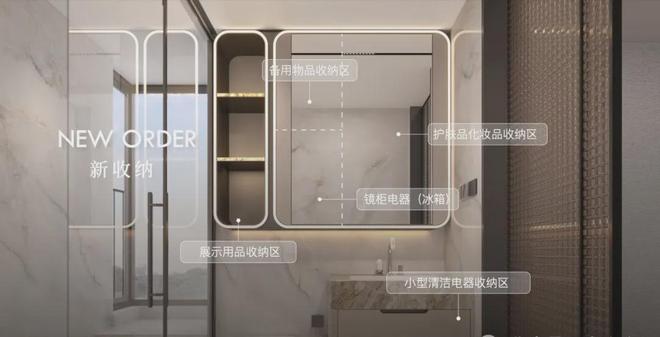 卫浴空间,把护肤、备品、小型清洁、展示用品、常用梳洗做了细致规整,女主人繁多的化妆品也能井井有条;